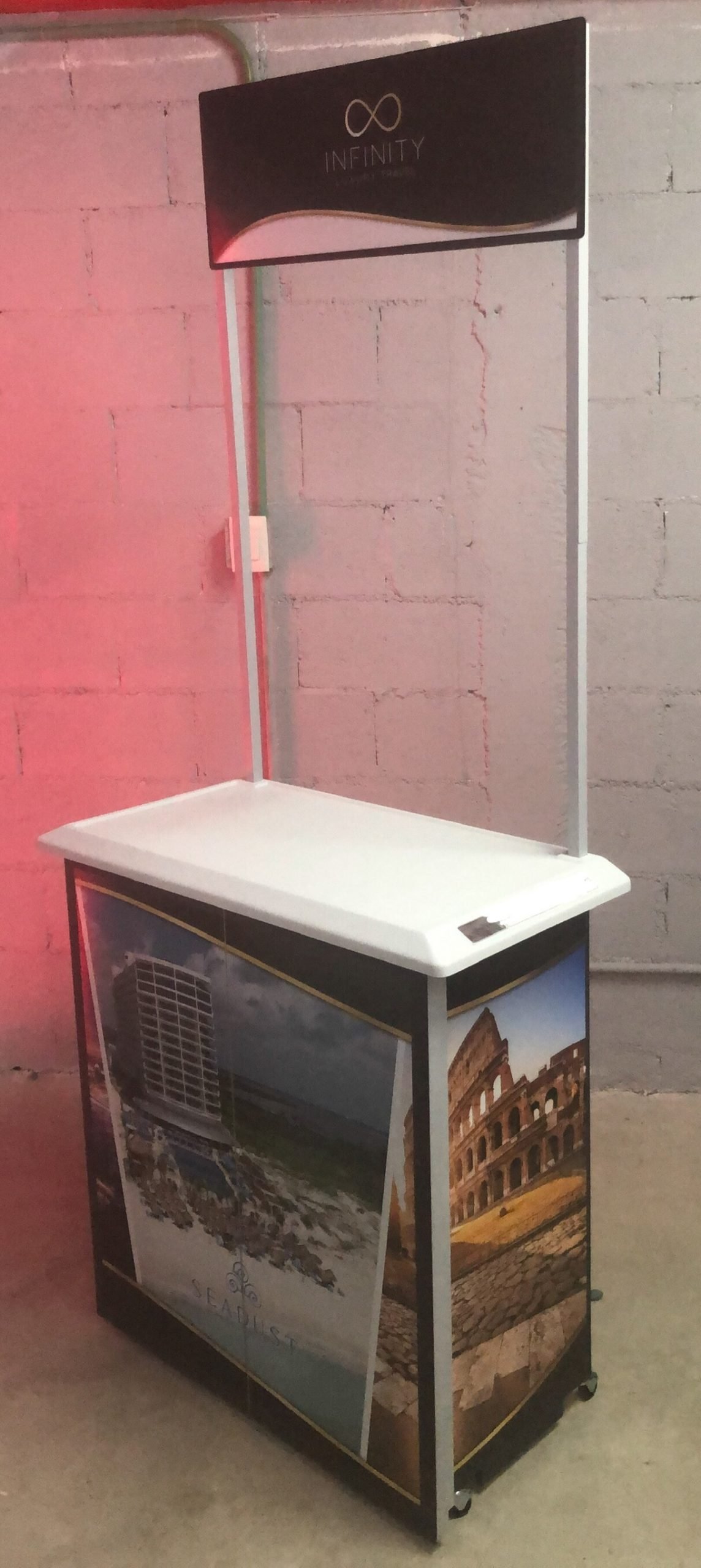 Display Portátil para Infinity Luxury Travel en Cancún. Display incluye puerta con cerradura y ruedas, es un demostrador muy completo que viene en varios colores @elstand #displayscancun